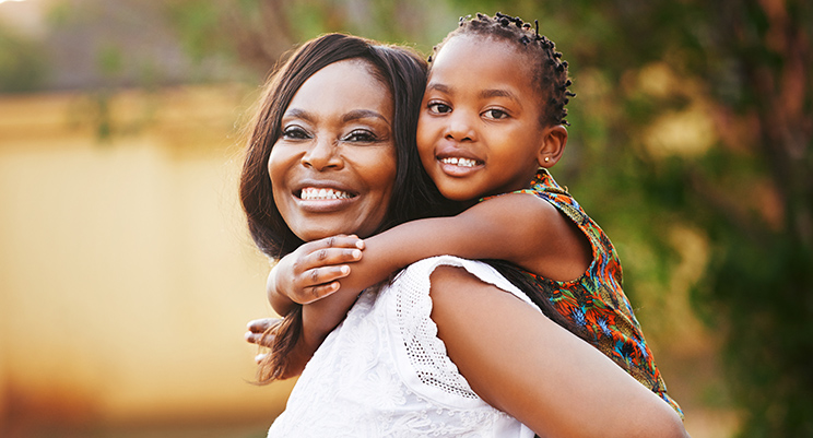 Portrait of a happy mother and daughter enjoying a piggyback ride outdoors